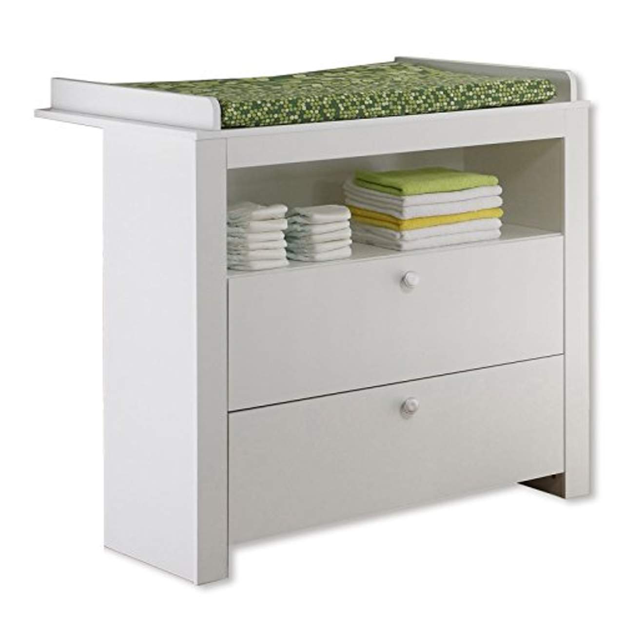 trendteam smart living Babyzimmer Wickelkommode Kommode OliviaDetails: Babyzimmer Wickelkommode Olivia GE1196-14 Front und Korpus in weiß Dekor Wickelkommode mit Wickelaufsatz B/H/T ca.: 96/104/69 cm 1 offenes Fach 2 Schubkästen Wickelfläche ca. 85 x 67 cm Wickelansatz abnehmbar GS-Zertifizierung für geprüfte Sicherheit Optional dazu bestellen: Wandregal / Garderobenpaneel B/H/T ca.: 75/20/15 cm 1 breiter Regalboden Rückwandpaneel verdeckte Wandbefestigung 3 Garderobenknöpfe Optional dazu bestellen: Regal für Wickelkommode B/H/T ca.: 25/93/32 cm links oder rechts hinter Wickelkommode stellbar 2 Regalböden, 3 offene Fächer Standregal, Wandregal und Filz-Applikationen Blau: bitte wählen Sie oben aus Optional: Regal für Wickelkommode B/H/T ca.: 25/93/32 cm links oder rechts hinter Wickelkommode stellbar 2 Regalböden, 3 offene Fächer Optional: Wandregal / Garderobenpaneel B/H/T ca.: 75/20/15 cm 1 breiter Regalboden Rückwandpaneel verdeckte Wandbefestigung 3 Garderobenknöpfe Optional: Filz-Applikationen Blau 2er Set für Wickelkommode Abnehmbare Applikationen für Griffe in dunkel- und hellblau Durchmesser ca. 10 cm Qualität: Moderne Wickelkommode mit praktischen Details Front und Korpus in weiß Dekor, strapazierfähige Melaminbeschichtung Wickelkommode zur Kommode umbaubar Metallschienen kugelgelagert Griffe silberfarben Pflegeleicht durch glatte Oberflächen, einfach feucht abwischen GS-Zertifizierung für geprüfte Sicherheit Lieferumfang:Zerlegt/Selbstmontage, inkl. bebilderte Aufbauanleitung Montage- und Befestigungsmaterial Dekoration, Auflagen, Matratzen und Elektrogeräte sind nicht enthalten Produktbeschreibung für Wickelkommode „Olivia“ weiß Die praktische und modern gestaltete Babyzimmer Wickelkommode „Olivia“ in weiß bietet Ihnen alles, was Sie zum Windeln und Wickeln Ihres Babys benötigen.Das Modell ist mit einer großzügig bemessenen Wickelfläche , zwei geräumigen Schubkästen sowie einem offenen Fach ausgestattet. Räumen Sie Windeln und Wäsche, Pflegeprodukte und kleines Spielzeug in die Ablagen und schon stehen Ihnen die Utensilien bei jedem Wechseln der Windeln zur Verfügung. Zum Öffnen und Schließen der Schübe dienen kleine Griffe in der Farbe weiß.Die Wickelauflage können Sie bei Bedarf abnehmen. Damit Ihr Kind weich und bequem liegt, statten Sie die Wickelauflage zusätzlich mit einem gepolsterten Kissen aus. Edle Fronten mit strapazierfähiger Beschichtung Babys erste Möbel müssen bestimmten Ansprüchen genügen.Sie sollten ausreichend Staufläche aufweisen, praktisch aufgeteilt und vor allem leicht zu reinigen sein. Die Wickelkommode „Olivia“ ist mit einer strapazierfähigen Beschichtung aus besten Materialien versehen und dank der glatten Oberflächen leicht zu pflegen. Die Wickelkommode können Sie um weitere Kleinmöbel aus dem Programm Babyzimmer „Olivia“ ergänzen.Wickelkommode jetzt bestellen Bestellen Sie jetzt diese hochwertige und praktische Kommode zum Wickeln des Nachwuchses. Die Wickelkommode „Olivia“ lässt sich individuell aufstellen und kann später als normale Kommode weiter genutzt werden. Kontaktieren Sie uns, sollten Sie Fragen zu der Kommode haben.Wir beraten Sie gern.