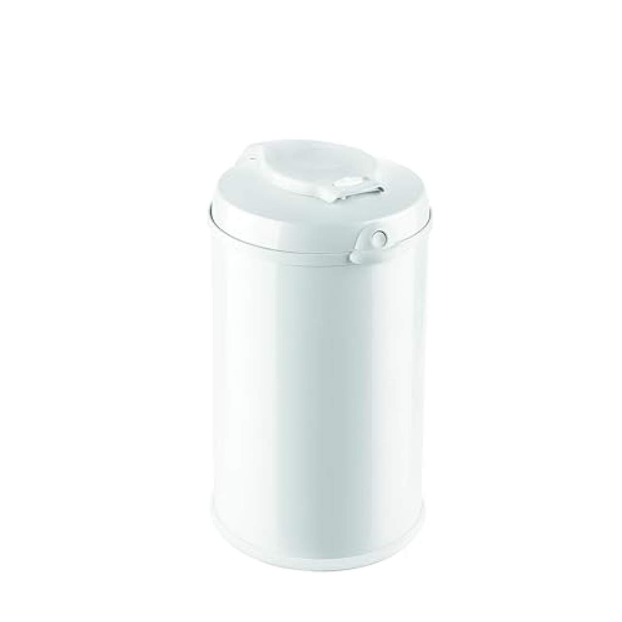 Dieser Windeleimer besteht aus langlebigem, weißem Stahl und ist mit Gummidichtungen ausgestattet, um unangenehme Gerüche effektiv einzudämmen.