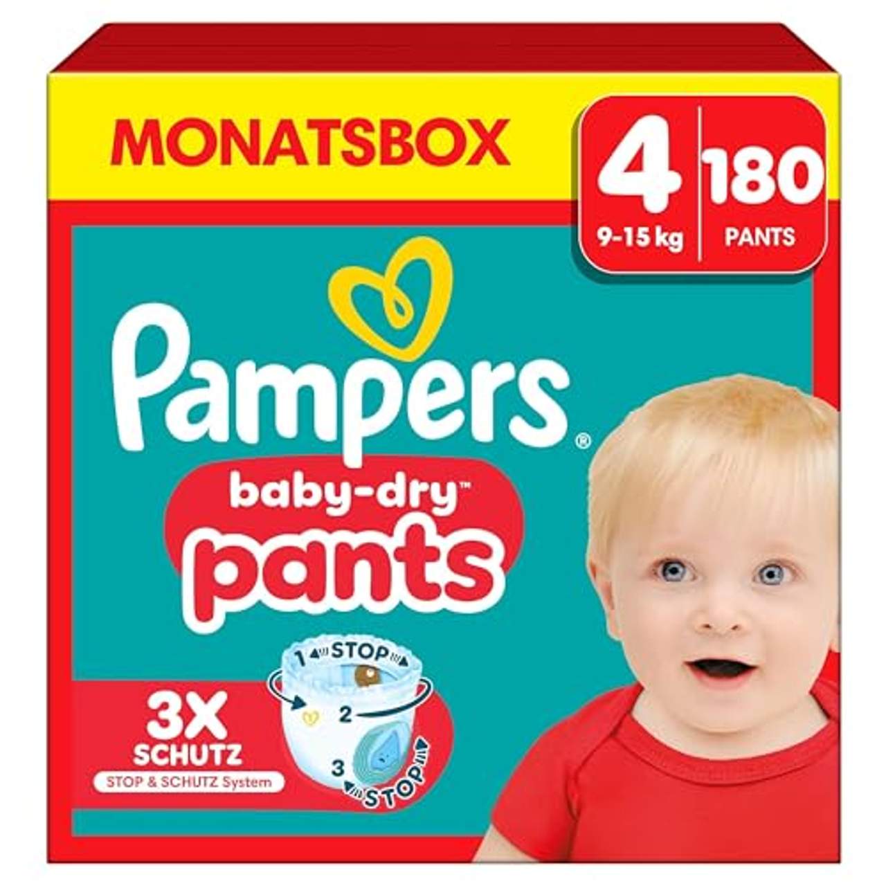Pampers Windeln Pants Größe 4Produktdetails: Pampers Baby-Dry Pants, Gr. 4, 9-15kg, Monatsbox Pampers Baby-Dry Pants mit revolutionärem Stop & Schutz Täschchen und 360° Fit für bis zu 12 Stunden Rundum-Auslaufschutz Sie verfügen außerdem über einen super saugkräftigen Kern, der Feuchtigkeit sofort aufnimmt, und Sicherheitsbündchen, die ein Auslaufen an den Beinen verhinder Wenn dein Baby anfängt, aktiver zu werden und sich beim Windelwechseln dreht, ist es Zeit für Pampers Baby-Dry Pants, die dank des rundum dehnbaren Bauchbündchen ganz einfach zu wechseln sind Mit ihren rundum dehnbaren Bauchbündchen ziehst du sie deinem Baby mit nur einem Zug an Pampers Baby-Dry Windeln sind dermatologisch getestet und enthalten 0% EU-Parfümallergene (gemäß EU-Kosmetikverordnung Nr.1223/2009) Im Lieferumfang enthalten: 180x Pampers Baby-Dry Pants, Gr. 4, 9-15kg