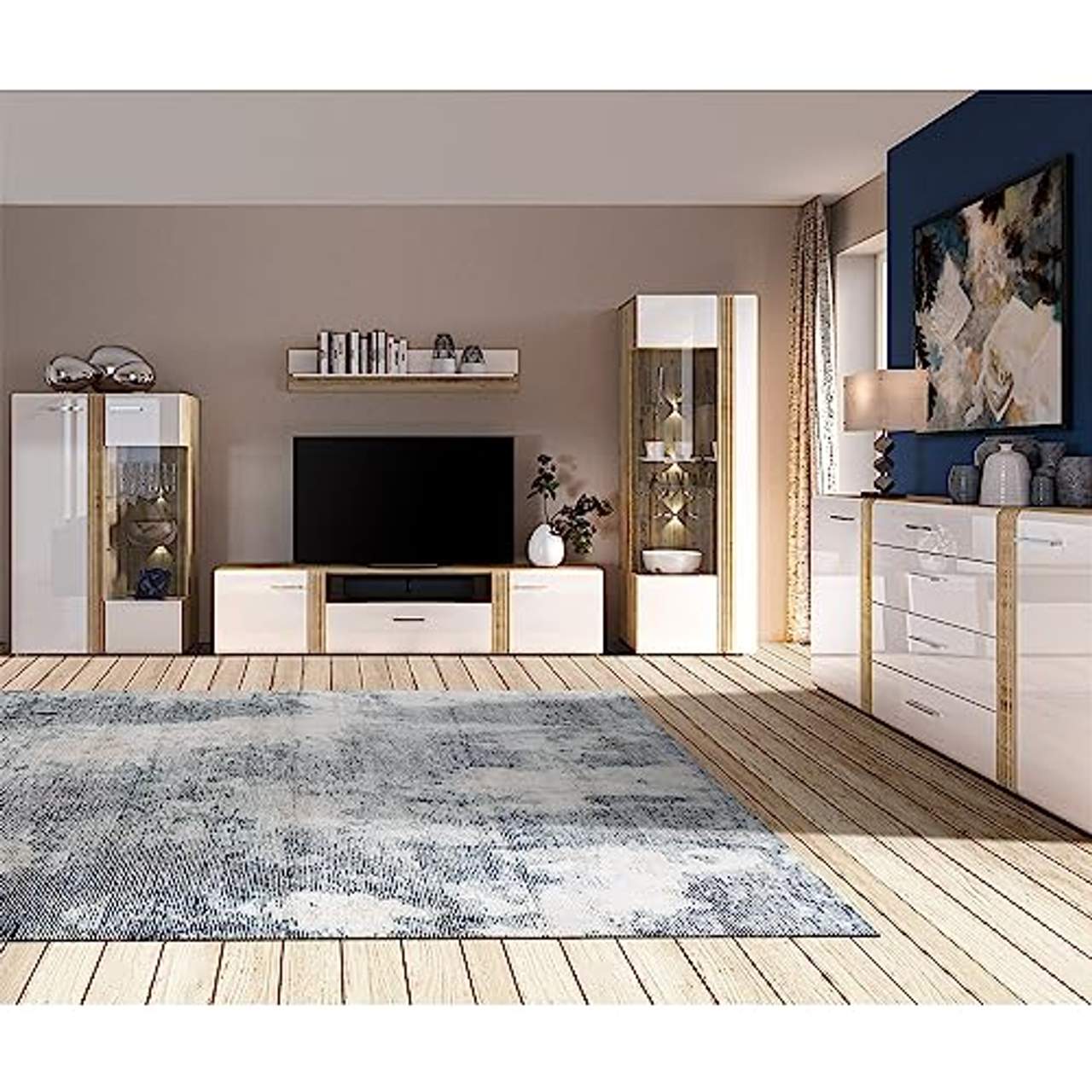 Lomadox Wohnwand 5-teiligAllgemeine Beschreibung Die Wohnwand AKRON-131 kombiniert modernes Design mit Funktionalität. Sie besteht aus einem warmen Eiche Dekor und hochglänzenden weißen Fronten, die aus hochwertigem MDF gefertigt sind. Die abgerundeten Kanten und die filigrane Rillenfräsung der Zierleiste verleihen den Möbeln einen eleganten Look.Die integrierte Beleuchtung in den Vitrinen setzt Ihre Lieblingsgegenstände perfekt in Szene, während das Soft Close System für ein leises Schließen der Türen sorgt. Technische daten Korpus: Qualitätsspanplatte Front: MDF Dekor in Castello Eiche Nb. mit weiß Hochglanz Griffe:Metall, chrom Türen: Softclose Funktion Schubkästen: Kugelführung mit Vollauszug Gesamtmaß Wohnwand B/H/T: ca. 397/200/42 cm (Breite inkl. 15 cm Zwischenabstand) Highboard Vitrine: B/H/T ca. 92/143/42 cm TV Lowboard: B/H/T ca. 210/47/42 cm Wandboard: B/H/T ca. 134/25/20 cm Vitrine: B/H/T ca. 65/196/42 cm Sideboard: B/H/T ca. 190/90/42 cm Montage Die Lieferung erfolgt zerlegt zur Selbstmontage.