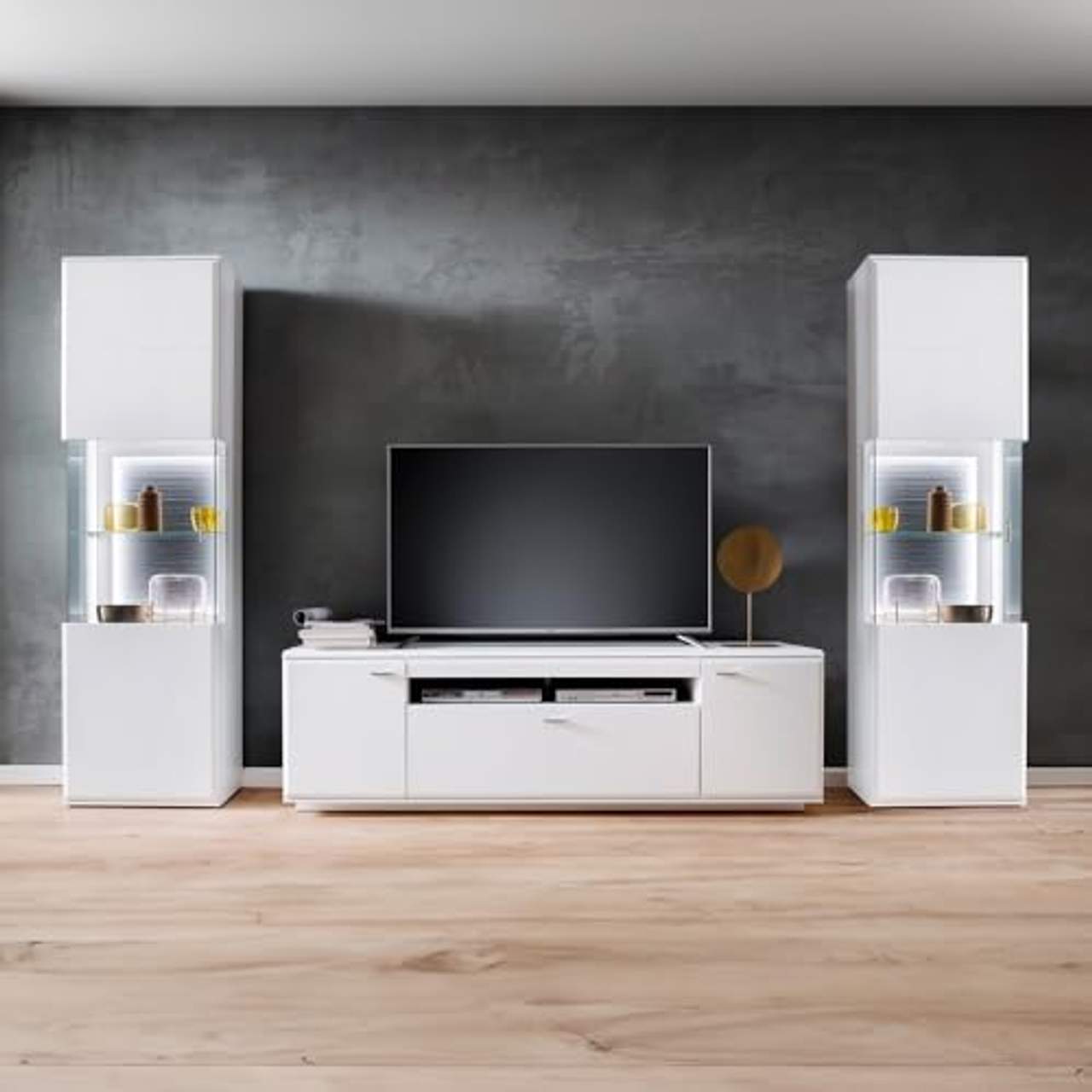 Lomadox Wohnwand TV-Wand 3-teiligAllgemeine Beschreibung Die Wohnwand ALIA-05 in modernem, mattem Weiß ist eine hochwertige und zeitlose Möbelserie, die deinem Zuhause Stil und Ordnung verleiht. Die Möbel sind bereits aufgebaut und sofort einsatzbereit, sodass du keine Zeit mit dem Zusammenbau verlieren musst.Hergestellt aus hochwertigem MDF, sorgt die tiefgezogene Beschichtung für eine glatte Oberfläche und einen edlen Look. Das schlichte Design schafft eine entspannte Atmosphäre und passt zu verschiedenen Einrichtungsstilen. Die Vitrinen-Elemente ermöglichen es dir, persönliche Schätze stilvoll zu präsentieren, während die anthrazitfarbene Rückwand mit 3D-Effekt einen besonderen Hingucker darstellt.Technische daten Material: MDF, tiefgezogen beschichtet Farbe/Dekor: weiß matt Rückwand Vitrinen Element: anthrazit 3D geschroppt Glas: Parsol-Glas grau Maße Vitrine: B/H/T ca. 60/208/38 cm Maße Lowboard: B/H/T ca. 195/60/51 cm Max. Belastbarkeit Deckplatte: 30 kg Lieferumfang 2x Vitrine mit 1 Tür und Glaseinsatz, 2