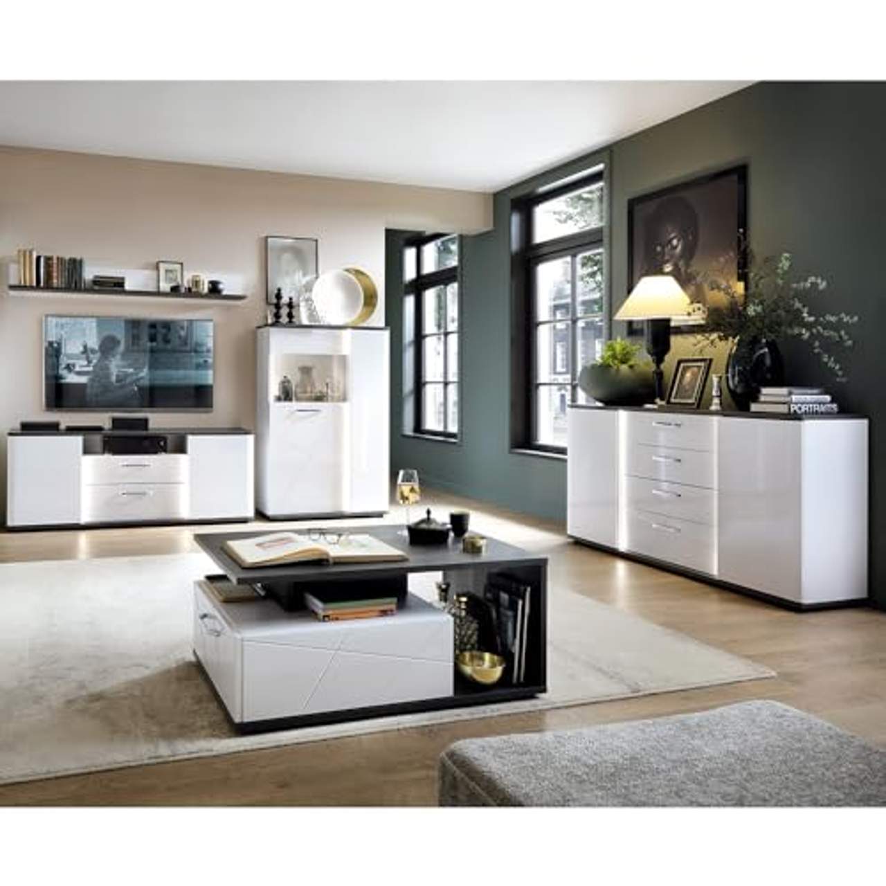 - Moderne Ästhetik: 1. Die moderne Ästhetik des "Lomadox Wohnwand Wohnmöbel Set weiß 5-teilig Modern" wertet jeden Wohn- oder Essbereich mit seinem schlichten Design und der hochglänzenden weißen Oberfläche in Kombination mit schwarzen Vicenza-Eichenholz-Akzenten auf. Dieser moderne Look verleiht deinem Zuhause nicht nur einen Hauch von Eleganz, sondern schafft auch eine helle und luftige Atmosphäre, die deine Räume geräumiger und einladender wirken lässt. Das stilvolle Erscheinungsbild ist perfekt für alle, die eine minimalistische und dennoch raffinierte Einrichtung schätzen. So kannst du deine Gäste beeindrucken und eine einladende Umgebung schaffen, die deinen persönlichen Geschmack widerspiegelt.