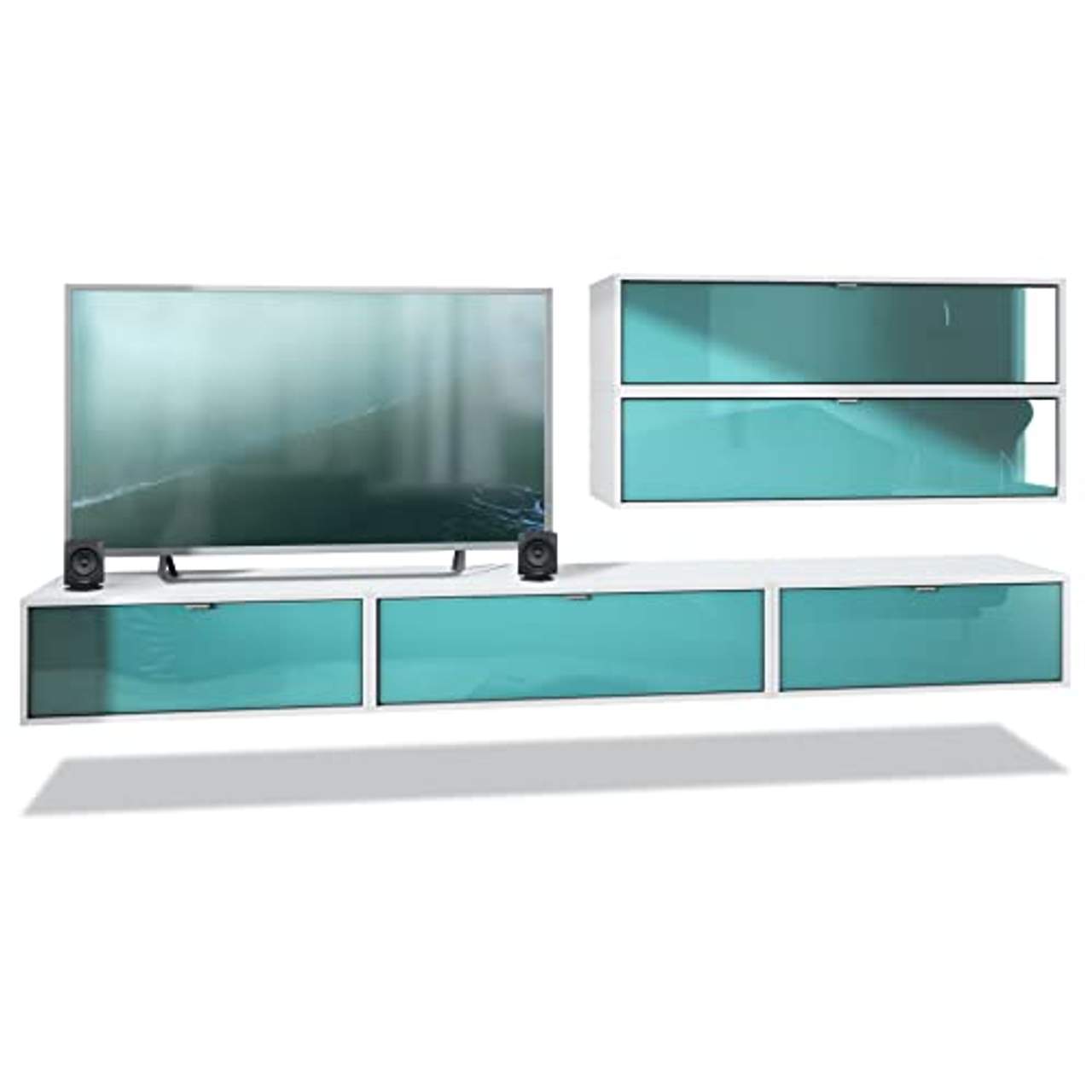 Der äußere Korpus der Vladon Wohnwand Lana V2 Anbauwand ist in einem matten Weiß gehalten, was ihr ein klares und minimalistisches Aussehen verleiht, das sich nahtlos in jeden Einrichtungsstil einfügt. Die Fronten der Schränke sind aus petrolfarbenem, hochglänzendem MDF gefertigt und setzen einen dezenten Farbakzent.