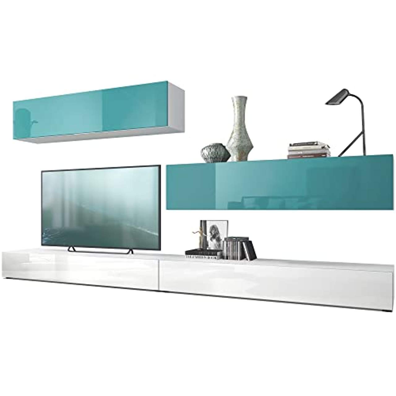 - Stilvolles Design: Diese Wohnwand hat einen modernen Look mit einem weißen, matten Korpus und weißen Hochglanz- oder petrolfarbenen Hochglanzfronten. Es gibt sie auch in vielen anderen Farbkombinationen, so dass du deinen Wohnraum ganz nach deinem Stil gestalten kannst.