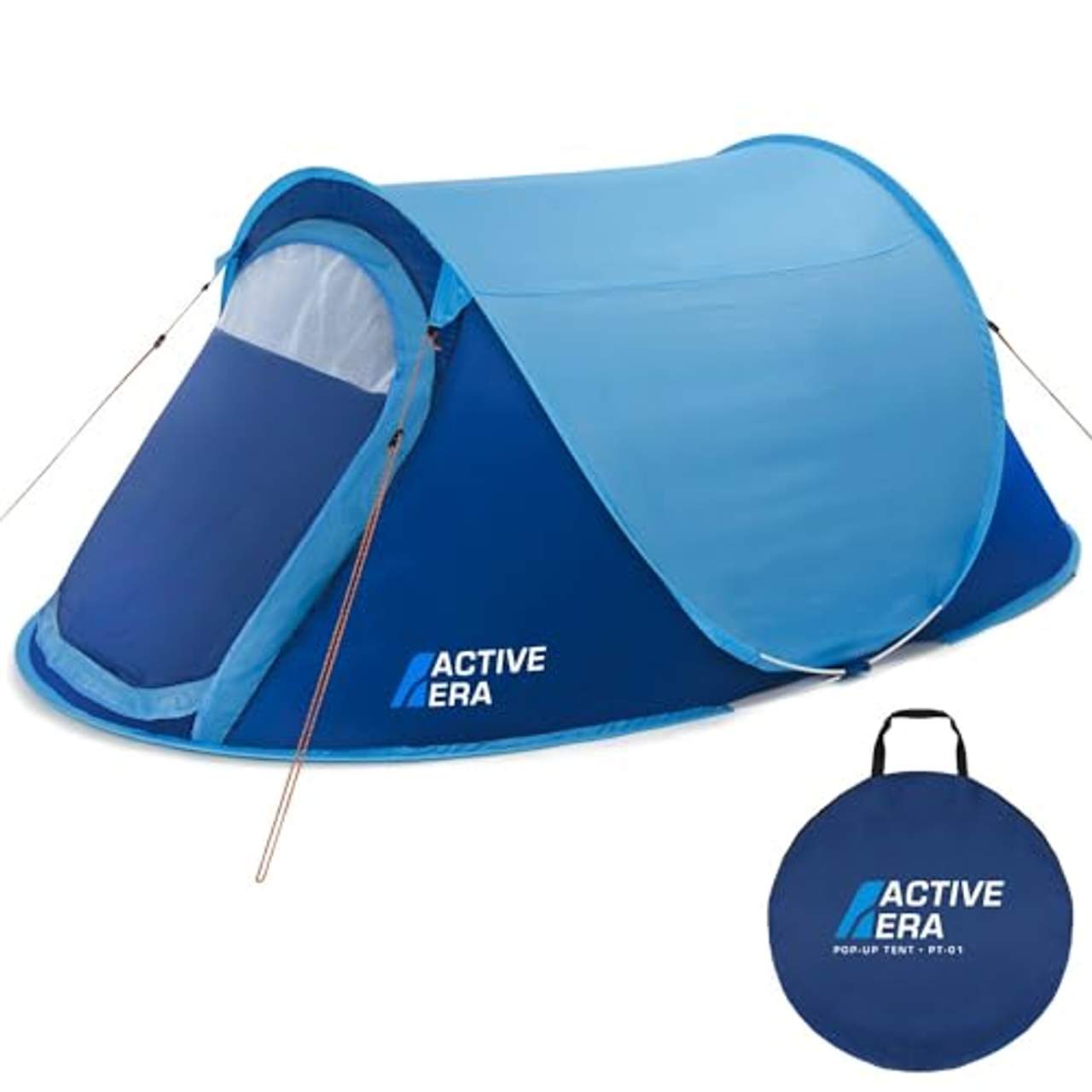 Active Era Zelt großPop-up-Zelt von Active Era für 2 PersonenDieses geräumige Pop-up-Zelt für zwei Personen von Active Era ist äußerst gut verarbeitet. Es wurde hergestellt aus sehr robustem wasserfestem Material und verfügt über ein Belüftungsfenster mit Reißverschluss sowie alle Merkmale, die Sie von einem hochwertigem Zelt erwarten. Die Nähte sind doppelt genäht und versiegelt, um Feuchtigkeit abzuhalten. Die PU-beschichtete Unterlegplane sorgt dafür, dass es im Zelt trocken bleibt, selbst wenn es auf einem feuchten Untergrund errichtet wird.Um das Zelt aufzubauen, muss es einfach aus der Tragetasche genommen und losgelassen werden. Zeltleinen und Heringe sind im Lieferumfang enthalten und ermöglichen eine schnelle und sichere Befestigung am Boden. Das Zelt lässt sich innerhalb weniger Sekunden zusammenfalten. Die Anleitung ist auf der Tragetasche aufgedruckt, sodass sie nicht verlorengehen kann.Technische Merkmale:8 x Zeltheringe