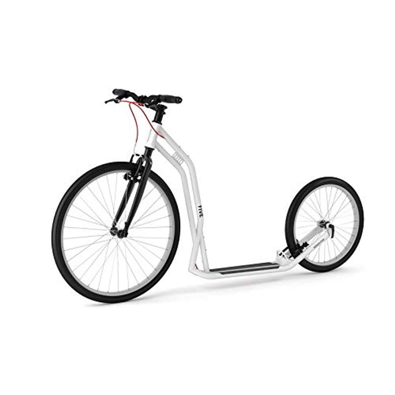 Yedoo Five Tretroller bis 130 kgDer Yedoo Number Five Tretroller überzeugt durch seine hochwertige und fortschrittliche Verarbeitung und ist optisch mit seinem sportlichen Design ein absoluter Hingucker.Der Scooter wurde mit robusten 26 und 20 Zoll Luftreifen ausgerüstet, die groß genug sind, um eine gute Geschwindigkeit zu erzielen und klein genug sind, um geschickte Manöver zu ermöglichen.Der stabile Stahlrahmen des Yedoo Number Five trägt eine Last von bis zu 130 kg.Trotz dieser enormen Tragfähigkeit ist der Scooter jedoch extrem wendig. Die Felgenbremsen versprechen eine ausgezeichnete Bremskraft, sodass der Roller schnell und sicher wieder zum Stehen kommt.Für besonderen Fahrkomfort sorgen die ergonomischen Lenkergriffe. Der Lenker ist höhenverstellbar und kann so optimal an die Bedürfnisse des Fahrers angepasst werden.Produkteigenschaften:Rahmen:Hi-Ten StahlrahmenGabel: Hi-Ten StahlLenker: AluminiumReifen: 26 / 20 Zoll KENDA LuftreifenMaximaler Reifendruck: 4,6 barFelgen: HJC AlloyErgonomische LenkergriffeBremse: V-Brake FelgenbremsenAluminium-BremshebelAluminiumfelgenSchnellspannhebel vorne und hintenNaben: NOVATEC AlloyNabenbreite (vorne / hinten): 100 / 74 mmEmpfohlene Mindest-Körpergröße: 130 cmMaximale Belastung: 130 kgGesamtlänge: 174 cmTrittbrettlänge: 40 cmLenkerbreite: 64 cmLenkerhöhe: 91 - 97 cmAbstand des Trittbretts zum Boden: 5,0 - 7,0 cmGewicht: 10,5 kgAltersempfehlung: 12 +,Farbe: Weiß