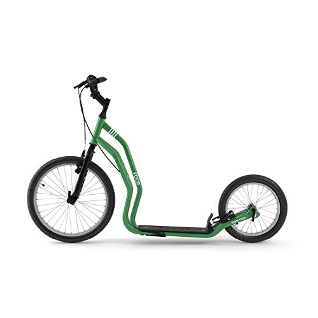 Yedoo Four Tretroller bis 150 kgDer Yedoo Number Four Tretroller überzeugt nicht nur durch seine hochwertige und fortschrittliche Verarbeitung, sondern ist auch optisch mit seinem sportlichen Design ein absoluter Hingucker.Der Scooter wurde mit robusten 20 und 16 Zoll Reifen ausgerüstet, die groß genug sind, um eine gute Geschwindigkeit zu erzielen und klein genug sind, um geschickte Manöver zu ermöglichen.Der Rahmen des Yedoo Number Four trägt eine Last von bis zu 150 kg.Trotz dieser enormen Tragfähigkeit ist der Scooter jedoch extrem wendig. Die V-Brake Felgenbremsen versprechen eine ausgezeichnete Bremskraft, sodass der Roller schnell und sicher wieder zum Stehen kommt.Für besonderen Fahrkomfort sorgen die ergonomischen Lenkergriffe. Der Lenker ist höhenverstellbar und kann so optimal an die Bedürfnisse des Fahrers angepasst werden.Technische Details:Rahmen:Hi-Ten StahlrahmenErgonomischer BremshebelBremse: V-Brake FelgenbremsenReifen: LuftreifenReifengröße: 20 Zoll vorne, 16 Zoll hintenAlufelgenEmpfohlene Mindest-Körpergröße: 150 cmMaximale Belastung: 150 kgGesamtlänge: 145 cmTrittbrettlänge: 40 cmLenkerbreite: 64 cmLenkerhöhe: 92 - 100 cmAbstand des Trittbretts zum Boden: 4,5 - 6,5 cmGewicht: 10,5 kgAltersempfehlung: 12 +,Farbe: Grün
